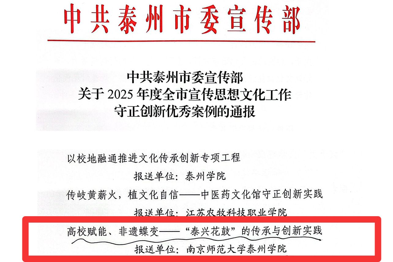 近日,中共泰州市委宣传部发布《2025年度全市宣传思想文化工作守正创新优秀案例通报》,我校音乐学院许文锦老师报送的《高校赋能、非遗蝶变——“泰兴花鼓”的传承与创新实践》项目成功入选,成为全市20项优秀案例之一。该项目聚焦地方非物质文化遗产“泰兴花鼓”的活态传承与创新转化,充分发挥高校在文化传承与创新领域的独特优势,着力构建“理论研究+课堂教学+艺术创作+舞台实践”四位一体的长效育人机制,推动非遗传承从“民间传承”...