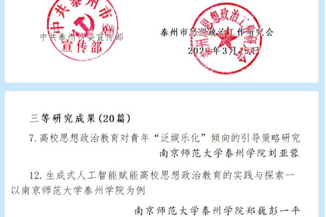 近日,泰州市委宣传部、泰州市思想政治工作研究会通报2025年度泰州市思想政治工作课题研究优秀成果评选结果,我院2项成果荣获三等奖,分别是:刘亚蓉老师的《高校思想政治教育对青年“泛娱乐化”倾向的引导策略研究》,郑巍、彭一平老师的《生成式人工智能赋能高校思想政治教育的实践与探索——以南京师范大学泰州学院为例》。这两项成果立足学院办学实际,聚焦红色文化育人、人工智能赋能思政教育等前沿领域,充分彰显了我院在思想政治工作理论研究与实践创新方面的扎实功底与鲜明特色。...