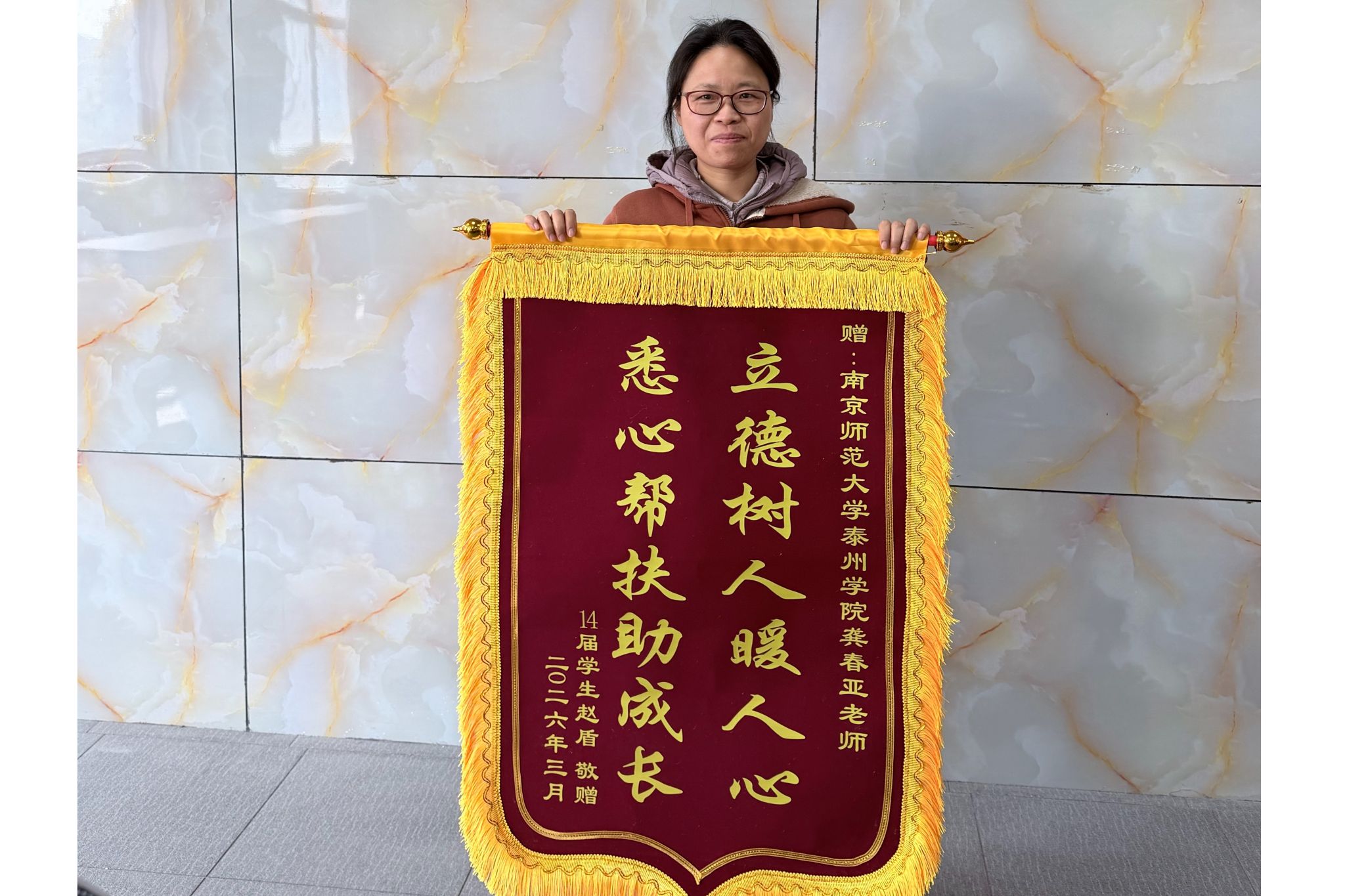 近日,我校信息工程学院收到通信工程专业(专转本)2014届毕业生赵盾寄来的感谢信与锦旗。锦旗上书“立德树人暖人心 悉心帮扶助成长”十四个字,充分体现了该生对我院教师龚春亚由衷感谢与高度认可。赵盾毕业后赴上海就业,正处于办理落户手续的关键时期。因审核要求严格,需补充大学期间的学籍证明材料,但本人身处外地,无法亲自返校办理,情况较为紧急。在此情况下,他尝试联系原班主任龚春亚老师请求协助。龚春亚老师得知学生困难后,...